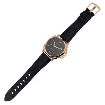 18kt rose gold case with a black alligator band. Fixed 18kt rose gold bezel. Black dial with index-Arabic numeral hour markers. Dial Type: Analog. Date display at the 3 o'clock position. One subdial displaying: small second. Panerai Calibre P.900 Automatic movement, based upon Panerai OP XXXIV, containing 25 Jewels, bitting at 28800 vph, and has a power reserve of approximately 72 hours. Scratch resistant sapphire crystal. Pull / push crown. Transparent see through case back. Cushion case shape, case size: 42 mm. Tang clasp. Water resistant at 30 meters / 100 feet. Functions: date, hour, minute, small second. Luminor Due Series. Luxury watch style. Watch label: Swiss Made. Panerai Luminor Due Automatic Black Dial Men's Watch PAM01041.