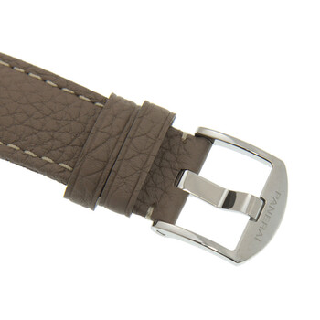Stainless steel case with a grey leather strap. Fixed stainless steel bezel. White dial with luminous silver-tone hands and index hour markers. Arabic numerals mark the 6 and 12 o'clock positions. Dial Type: Analog. Luminescent hands and markers. Date display at the 3 o'clock position. Small second sub-dial at the 9 o'clock position. Panerai calibre P.900 automatic movement, based upon Panerai OP XXXIV, containing 25 Jewels, bitting at 28800 vph, and has a power reserve of approximately 72 hours. Scratch resistant sapphire crystal. Screw down crown. Solid case back. Cushion case shape. Case size: 38 mm. Band width: 20 mm / 18 mm. Tang clasp. Water resistant at 30 meters / 100 feet. Functions: date, hour, minute, second. Additional Info: original box, international warranty card, manual (complete accessories). Luxury watch style. Watch label: Swiss Made. Panerai Luminor Due Automatic White Dial 38 mm Watch PAM01043.