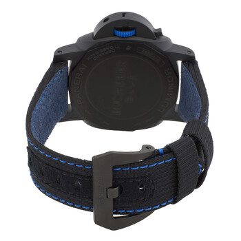 Black ceramic case with a black nylon strap. Fixed black ceramic bezel. Black dial with black hands and index-Arabic numeral hour markers. Dial Type: Analog. Luminescent hands and markers. Date display at the 3 o'clock position. One subdial displaying: small second. Panerai Calibre P.9010 Automatic movement, containing 31 Jewels, composed of 200 parts, bitting at 28800 vph, and has a power reserve of approximately 72 hours. Scratch resistant sapphire crystal. Solid case back. Cushion case shape, case size: 44 mm. Buckle clasp. Water resistant at 100 meters / 330 feet. Functions: date, hour, minute, small second. Luminor Series. Luxury watch style. Watch label: Swiss Made. Panerai Luminor Automatic Black Dial Men's Watch PAM01176.