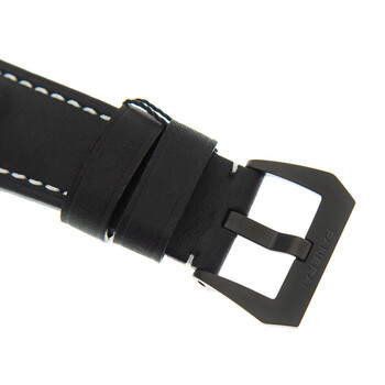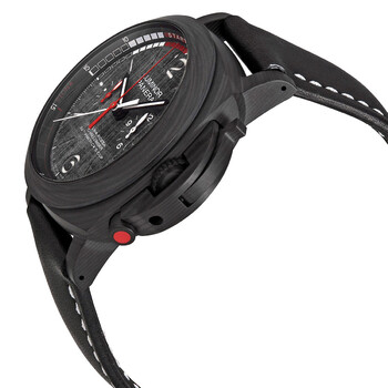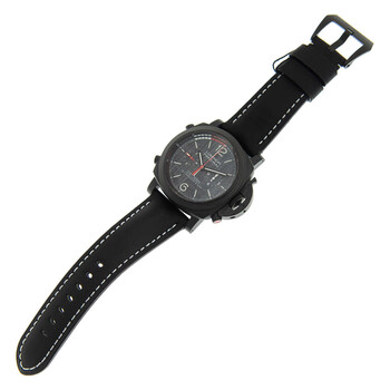 Black carbotech case with a black leather strap. Fixed black carbotech bezel. Grey dial with luminous black hands and index hour markers. Arabic numerals appear at the 6 and 12 o'clock positions. Minute markers. Regatta markings around the outer rim. Dial Type: Analog. Luminescent hands and markers. Chronograph - two sub-dials displaying: small seconds and 12 hours. Panerai Calibre P.9100 Automatic movement, containing 37 Jewels, composed of 302 parts, bitting at 28800 vph, and has a power reserve of approximately 72 hours. Scratch resistant sapphire crystal. Screw down crown. Solid case back. Cushion case shape. Case size: 47 mm. Case thickness: 18.4 mm. Tang clasp. Water resistant at 100 meters / 330 feet. Functions: chronograph, column wheel, flyback, date, hour, minute, second. Luminor Luna Rossa Series. Sport watch style. Watch label: Swiss Made. Panerai Luminor Luna Rossa Regatta Chronograph Automatic Grey Dial Men's Watch PAM01038.