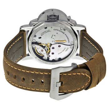 Stainless steel case with a brown leather strap. Fixed stainless steel bezel. Black dial with luminous hands and index hour markers. Arabic numerals mark the 3, 6 and 12 o'clock position. Dial Type: Analog. Luminescent hands and markers. Small seconds sub-dial. Panerai calibre P.3001 hand wind movement, containing 21 Jewels, composed of 207 parts, bitting at 21600 vph, and has a power reserve of approximately 72 hours. Scratch resistant sapphire crystal. Protected screw down crown. Skeleton case back. Cushion case shape. Case size: 47 mm. Case thickness: 17 mm. Band width: 26 mm /22 mm. Tang clasp. Water resistant at 100 meters / 330 feet. Functions: hour, minute, second. Luxury watch style. Watch label: Swiss Made. Panerai Luminor Marina 1950 3 Day Black Dial Men's Watch PAM00422.