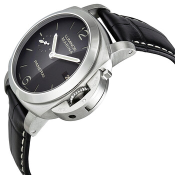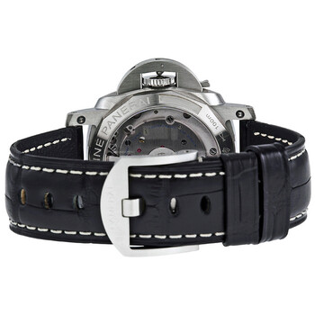 Silver-tone stainless steel case with a black alligator leather strap. Fixed silver-tone stainless steel bezel. Black dial with luminous hands and stick hour markers. Arabic numerals mark the 6 and 12 o'clock positions. Dial Type: Analog. Luminescent hands and markers. Date display at the 3 o'clock position. Small seconds sub-dial at the 9 o'clock position subdials. Panerai Calibre P.9000 Automatic movement, containing 28 Jewels, composed of 197 parts, bitting at 28800 vph, and has a power reserve of approximately 72 hours. Scratch resistant sapphire crystal. Protected stainless steel crown. Skeleton case back. Cushion case shape, case size: 42 mm, case thickness: 17 mm. Band width: 22 mm, band length: 8.5 inches. Tang clasp. Water resistant at 100 meters / 330 feet. Functions: date, hour, minute, small second. Luxury watch style. Watch label: Swiss Made. Panerai Luminor Marina 1950 Automatic Black Dial Men's Watch PAM00392.