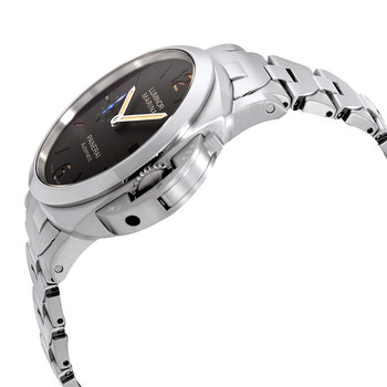 Silver-tone stainless steel case and bracelet. Fixed silver-tone stainless steel bezel. Black dial with luminous silver-tone hands and index hour markers. Arabic numerals mark the 6 and 12 o'clock positions. Dial Type: Analog. Luminescent hands and markers. Date display at the 3 o'clock position. One subdial displaying: small seconds. Panerai Calibre P.9010 Automatic movement, containing 31 Jewels, composed of 200 parts, bitting at 28800 vph, and has a power reserve of approximately 72 hours. Scratch resistant sapphire crystal. Push and lock crown. Transparent case back. Cushion case shape, case size: 42 mm, case thickness: 13.2 mm. Band width: 22 mm. Deployment with push button release clasp. Water resistant at 300 meters / 1000 feet. Functions: date, hour, minute, second. Luminor Marina 1950 Series. Luxury watch style. Watch label: Swiss Made. Panerai Luminor Marina 1950 Automatic Black Dial Men's Watch PAM00722.