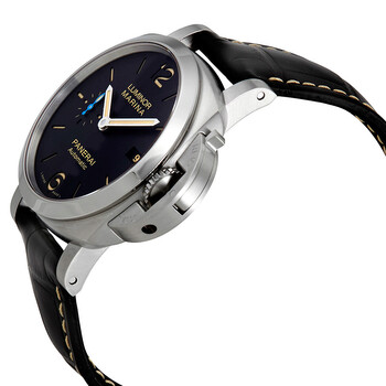 Silver-tone stainless steel case with a black (alligator) leather strap. Fixed silver-tone stainless steel bezel. Black dial with luminous silver-tone hands and index hour markers. Arabic numerals mark the 6 and 12 o'clock positions. Dial Type: Analog. Luminescent hands. Date display at the 3 o'clock position. One subdial displaying: small second. Panerai Calibre P.9010 Automatic movement, containing 31 Jewels, composed of 200 parts, bitting at 28800 vph, and has a power reserve of approximately 72 hours. Scratch resistant sapphire crystal. Cushion case shape, case size: 42 mm, case thickness: 13.2 mm. Band width: 20 mm. Tang clasp. Water resistant at 100 meters / 330 feet. Functions: date, hour, minute, second. Luminor Marina 1950 3 Days Series. Luxury watch style. Watch label: Swiss Made. Panerai Luminor Marina 1950 Automatic Black Dial Men's Watch PAM01392.