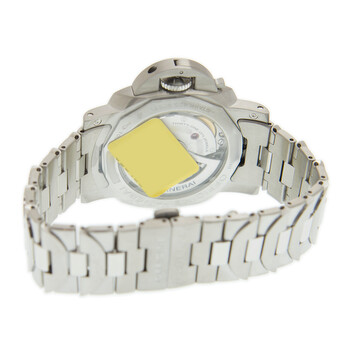Stainless steel case with a stainless steel bracelet. Fixed stainless steel bezel. Blue sunburst dial with luminous silver-tone hands and index hour markers. Arabic numerals appear at the 6 and 12 o'clock positions. Dial Type: Analog. Luminescent hands. Date display at the 3 o'clock position. Small seconds sub-dial. Panerai calibre P.9010 automatic movement, containing 31 Jewels, composed of 200 parts, bitting at 28800 vph, and has a power reserve of approximately 72 hours. Scratch resistant sapphire crystal. Transparent case back. Cushion case shape. Case size: 42 mm. Fold over clasp. Water resistant at 100 meters / 330 feet. Functions: date, hour, minute, small second. Luminor Marina 1950 Series. Luxury watch style. Watch label: Swiss Made. Panerai Luminor Marina 1950 Automatic Men's Watch PAM01028.