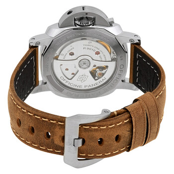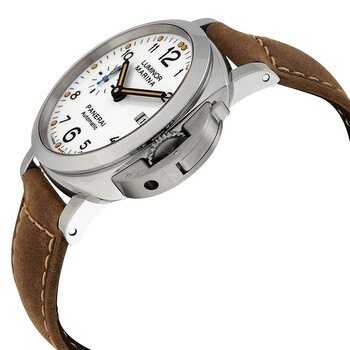 Stainless steel case with a brown leather strap. Fixed stainless steel bezel. White dial with luminous black hands and Arabic numeral hour markers. Minute markers around the outer rim. Dial Type: Analog. Luminescent hands and markers. Date display at the 3 o'clock position. Small seconds sub-dial at the 9 o'clock positions. Panerai calibre P.9010 automatic movement, containing 31 Jewels, composed of 200 parts, bitting at 28800 vph, and has a power reserve of approximately 72 hours. Scratch resistant sapphire crystal. Transparent case back. Cushion case shape. Case size: 42 mm. Band width: 22 mm. Tang clasp. Water resistant at 100 meters / 330 feet. Functions: date, hour, minute, second. Luxury watch style. Watch label: Swiss Made. Panerai Luminor Marina 1950 Automatic White Dial 42 mm Men's Watch.