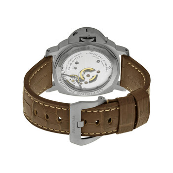 Grey titanium case with a black rubber strap. Fixed grey titanium bezel. Brown dial with black hands and index hour markers. Arabic numerals mark the 3, 6 and 12 o'clock positions. Dial Type: Analog. Luminescent hands and markers. One subdial displaying: small second. Panerai Calibre P.5000 Hand Wind movement, containing 21 Jewels, composed of 127 parts, bitting at 21600 vph, and has a power reserve of approximately 192 hours. Scratch resistant anti-reflective sapphire crystal. Screw down crown. Skeleton case back. Cushion case shape, case size: 44 mm, case thickness: 13 mm. Band width: 22.9 mm, band length: 9 inches. Tang clasp. Water resistant at 300 meters / 1000 feet. Functions: hour, minute, small second. Additional Info: this watch comes with an extra rubber strap. Luminor Marina 8 Days Titanio Series. Dive watch style. Watch label: Swiss Made. Panerai Luminor Marina 8 Days Titanio Mechanical Men's Watch PAM00564.