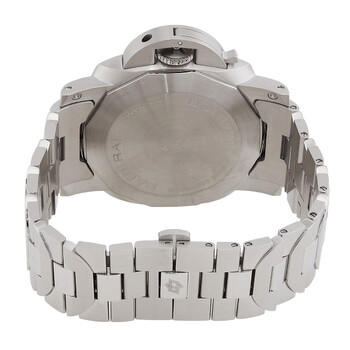 Silver-tone stainless steel case and bracelet. Fixed silver-tone stainless steel bezel. Black dial with silver-tone hands and Arabic numeral hour markers. Dial Type: Analog. Luminescent hands and markers. Date display at the 3 o'clock position. One subdial displaying: small second. Panerai Calibre P.9010 Automatic movement, containing 31 Jewels, composed of 200 parts, bitting at 28800 vph, and has a power reserve of approximately 72 hours. Scratch resistant sapphire crystal. Screw down crown. Solid case back. Round case shape, case size: 44 mm. Fold over clasp with a safety release. Water resistant at 300 meters / 1000 feet. Functions: date, hour, minute, small second. Additional Info: original box, international warranty card, manual (complete accessories). Luminor Marina Series. Dive watch style. Watch label: Swiss Made. Panerai Luminor Marina Automatic Black Dial Men's Watch PAM01562.