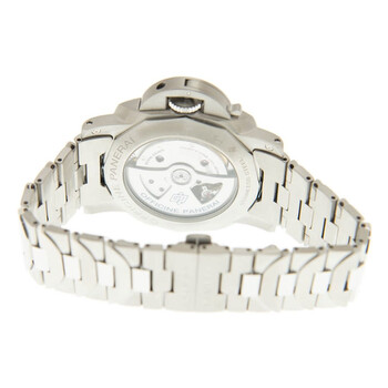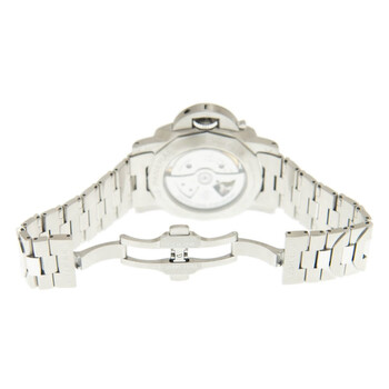 Stainless steel case with a stainless steel bracelet. Fixed silver-tone stainless steel bezel. Blue dial with luminbous silver-tone hands and index hour markers. Arabic numerals appear at the 6 and 12 o'clockl positions. Dial Type: Analog. Luminescent hands. Date display at the 3 o'clock position. Small seconds sub-dial. Panerai calibre P.9010 automatic movement, containing 31 Jewels, composed of 200 parts, bitting at 28800 vph, and has a power reserve of approximately 72 hours. Scratch resistant sapphire crystal. Pull / push crown. Transparent case back. Cushion case shape. Case size: 44 mm. Fold over clasp with a push button release. Water resistant at 300 meters / 1000 feet. Functions: date, hour, minute, small second. Luminor Marina Series. Luxury watch style. Watch label: Swiss Made. Panerai Luminor Marina Automatic Blue Dial Men's Watch PAM01058.