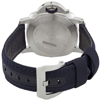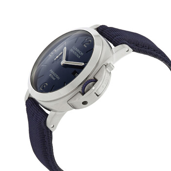 Silver-tone stainless steel case with a blue canvas strap. Fixed silver-tone stainless steel bezel. Blue dial with silver-tone hands and index hour markers. Dial Type: Analog. Luminescent hands and markers. Date display at the 3 o'clock position. One subdial displaying: small second. Panerai Calibre P.9010 Automatic movement, containing 31 Jewels, composed of 200 parts, bitting at 28800 vph, and has a power reserve of approximately 72 hours. Scratch resistant sapphire crystal. Screw down crown. Cushion case shape, case size: 44 mm. Water resistant at 300 meters / 1000 feet. Functions: date, hour, minute, small second. Additional Info: original box, manual (complete accessories). Luminor Marina Series. Luxury watch style. Watch label: Swiss Made. Panerai Luminor Marina Automatic Blue Dial Men's Watch PAM01157.