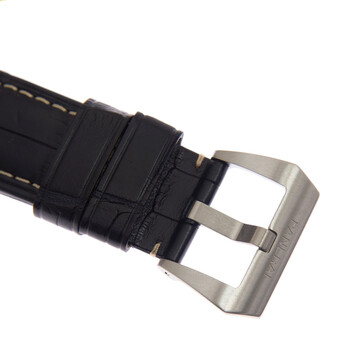Stainless steel case with a blue (alligator) leather strap. Fixed stainless steel bezel. Blue dial with luminous silver-tone hands and index hour markers. Arabic numerals appear at the 6, 9 and 12 o'clock positions. Dial Type: Analog. Luminescent hands and markers. Date display at the 3 o'clock position. Small seconds sub-dial at the 9 o'clock position. . Panerai calibre P.9010 automatic movement, containing 31 Jewels, composed of 200 parts, bitting at 28800 vph, and has a power reserve of approximately 72 hours. Scratch resistant sapphire crystal. Pull / push crown. Solid case back. Cushion case shape. Case size: 44 mm. Case thickness: 14 mm. Tang clasp. Water resistant at 300 meters / 1000 feet. Functions: date, hour, minute, small second. Luminor Marina Series. Luxury watch style. Watch label: Swiss Made. Panerai Luminor Marina Automatic Blue Dial Men's Watch PAM01313.