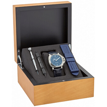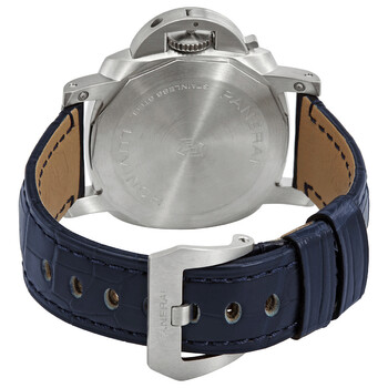 Stainless steel case with a blue (alligator) leather strap. Fixed stainless steel bezel. Blue dial with luminius silver-tone hands and index hour markers. Arabic numerals appear atthe 6 and 12 o'clock positions. Dial Type: Analog. Luminescent hands and markers. Date display at the 3 o'clock position. Small seconds subv-dial at the 9 o'clock position. Panerai calibre P.9010 automatic movement, containing 31 Jewels, composed of 200 parts, bitting at 28800 vph, and has a power reserve of approximately 72 hours. Scratch resistant sapphire crystal. Pull / push crown. Solid case back. Cushion case shape. Case size: 42 mm. Tang clasp. Water resistant at 30 meters / 100 feet. Functions: date, hour, minute, small second. Additional Info: original box, manual (complete accessories). Luminor Series. Luxury watch style. Watch label: Swiss Made. Panerai Luminor Marina Automatic Blue Dial Men's Watch PAM01393.