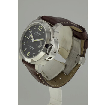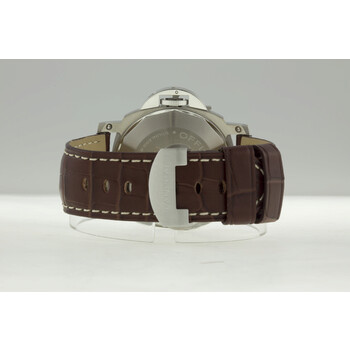 Silver-tone stainless steel case with a brown leather strap. Fixed silver-tone polished stainless steel bezel. Black dial with luminous hands and Arabic numeral hour markers. Minute markers around the outer rim. Dial Type: Analog. Luminescent hands and markers. Date display at the 3 o'clock position. Seconds sub-dial at the 9 o'clock position subdials. Panerai Calibre OP III Automatic movement, based upon 7750-P1, containing 21 Jewels, bitting at 28800 vph, and has a power reserve of approximately 42 hours. Scratch resistant domed anti-reflective sapphire crystal. Stainless steel with patented locking mecha crown. Solid case back. Cushion case shape. Case size: 44 mm. Deployment clasp. Water resistant at 300 meters / 1000 feet. Functions: date, hour, minute, small second, chronometer. Additional Info: includes additional rubber strap. Dive watch style. Watch label: Swiss Made. Panerai Luminor Marina Automatic Men's Watch PAM00164.