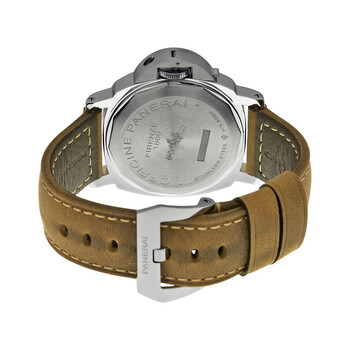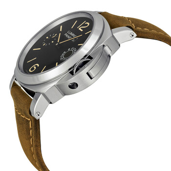 Limited Edition of 2000 Pieces - Stainless steel case with a tan leather strap. Fixed stainless steel bezel. Black vintage dial with luminous hands and index hour markers. Arabic numerals mark the 6 and 12 o'clock positions. Dial Type: Analog. Small seconds sub-dial at the 9 o'clock position. Hand wind movement with a 192-hour power reserve. Scratch resistant sapphire crystal. Protected crown. Solid case back. Case diameter: 44 mm. Case thickness: 15 mm. Cushion case shape. Tang clasp. Water resistant at 300 meters / 1000 feet. Functions: hour, minute, second. Luxury watch style. Watch label: Swiss Made. Panerai Luminor Marina Black Dial Tan Leather Men's Watch PAM00590.