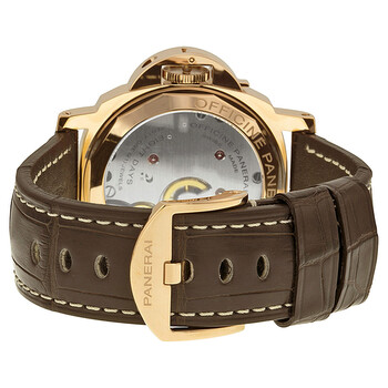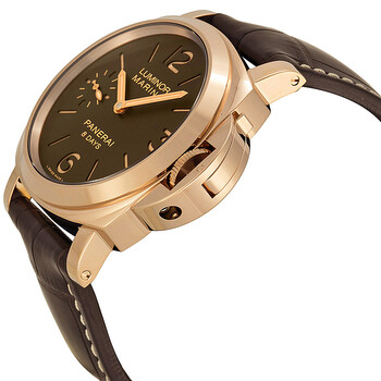 18kt rose gold case with a brown alligator leather strap. Fixed 18kt rose gold bezel. Brown dial with luminous hands and index hour markers. Arabic numerals mark the 3, 6 and 12 o'clockl positions. Dial Type: Analog. Luminescent hands and markers. Small second sub-dial at the 9 'clock position subdials. Panerai Calibre P.5000 Hand Wind movement, containing 21 Jewels, composed of 127 parts, bitting at 21600 vph, and has a power reserve of approximately 192 hours. Scratch resistant sapphire crystal. Skeleton case back. Cushion case shape. Case size: 44 mm. Fold over clasp. Water resistant at 30 meters / 100 feet. Functions: hour, minute, small second. Luxury watch style. Watch label: Swiss Made. Panerai Luminor Marina Brown Dial 18kt Rose Gold Men's Watch PAM00511.