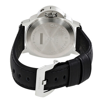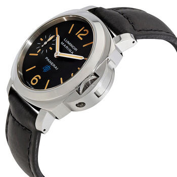 Silver-tone stainless steel case with a black leather strap. Fixed silver-tone stainless steel bezel. Black dial with luminous gold-tone hands and index hour markers. Arabic numerals mark the 3, 6 and 9 o'clock positions. Dial Type: Analog. Luminescent hands and markers. Small seconds subdials. Panerai Calibre OP II Hand Wind movement, based upon ETA 6497-1, containing 17 Jewels, bitting at 21600 vph, and has a power reserve of approximately 56 hours. Scratch resistant sapphire crystal. Solid case back. Cushion case shape. Case size: 44 mm. Band width: 24 mm. Tang clasp. Water resistant at 100 meters / 330 feet. Functions: hour, minute, small second, chronometer. Luxury watch style. Watch label: Swiss Made. Panerai Luminor Marina Hand Wound Black Dial Men's Watch PAM00631.