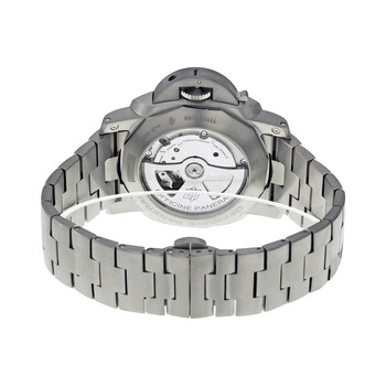 Grey titanium case with a grey titanium bracelet. Fixed grey titanium bezel. Brown dial with luminous hands and index hour markers. Arabic numerals mark the 6, 9, and 12 o'clock position. Dial Type: Analog. Luminescent hands and markers. Date display at the 3 o'clock position. Seconds sub-dial at the 9 o'clock position subdials. Panerai Calibre P.9000 Automatic movement, containing 28 Jewels, composed of 197 parts, bitting at 28800 vph, and has a power reserve of approximately 72 hours. Scratch resistant sapphire crystal. Screw down crown. Transparent case back. Cushion case shape, case size: 44 mm, case thickness: 15 mm. Band width: 22.9 mm, band length: 8.75 inches. Hidden fold over push button clasp. Water resistant at 300 meters / 1000 feet. Functions: hours, minutes, seconds, calendar. Dive watch style. Watch label: Swiss Made. Panerai Luminor Marina Men's Watch PAM00352.