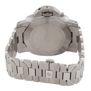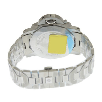 Stainless steel case with a stainless steel bracelet. Fixed stainless steel bezel. Blue sun-brushed dial with luminous silver-tone hands and index hour markers. Arabic numerals appear atthe 6, 9 and 12 o'clock positions. Dial Type: Analog. Luminescent hands. Date display at the 3 o'clock position. Small seconds sub-disal at the 9 o'clock position . Panerai calibre P.9010 automatic movement, containing 31 Jewels, composed of 200 parts, bitting at 28800 vph, and has a power reserve of approximately 72 hours. Scratch resistant sapphire crystal. Pull / push crown. Solid case back. Cushion case shape. Case size: 44 mm. Deployment clasp. Water resistant at 30 meters / 100 feet. Functions: date, hour, minute, small second. Luminor Marina Series. Luxury watch style. Watch label: Swiss Made. Panerai Luminor Marina Specchio Blu Automatic Men's Watch.