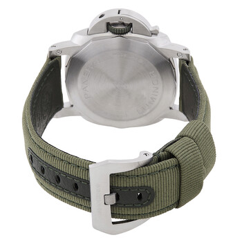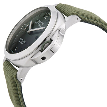 Silver-tone stainless steel case with a green canvas strap. Fixed silver-tone stainless steel bezel. Green dial with silver-tone hands and index hour markers. Dial Type: Analog. Luminescent hands and markers. Date display at the 3 o'clock position. One subdial displaying: small second. Panerai Calibre P.9010 Automatic movement, containing 31 Jewels, composed of 200 parts, bitting at 28800 vph, and has a power reserve of approximately 72 hours. Scratch resistant sapphire crystal. Screw down crown. Solid case back. Round case shape, case size: 44 mm. Water resistant at 300 meters / 1000 feet. Functions: date, hour, minute, small second. Additional Info: original box, international warranty card, manual (complete accessories). Luminor Marina Verde Smeraldo Series. Dive watch style. Watch label: Swiss Made. Panerai Luminor Marina Verde Smeraldo Automatic Green Dial Men's Watch PAM01356.
