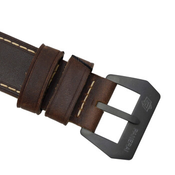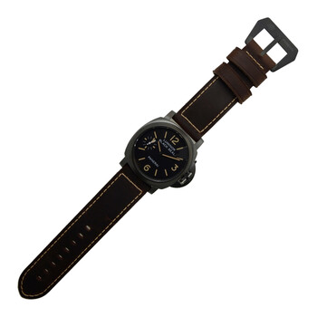 Black stainless steel case with a brown leather strap. Fixed black stainless steel bezel. Black dial with black hands and Arabic numeral and index hour markers. Dial Type: Analog. Luminescent markers. One - small second subdial. Panerai Calibre P.5000 Hand Wind movement, containing 21 Jewels, composed of 127 parts, bitting at 21600 vph, and has a power reserve of approximately 192 hours. Scratch resistant sapphire crystal. Screw down crown. Solid steel case back. Cushion case shape, case size: 44 mm, case thickness: 24 mm. Buckle clasp. Water resistant at 300 meters / 1000 feet. Functions: hour, minute, small second. Additional Info: limited edition of 500 units. Dive watch style. Watch label: Swiss Made. Panerai Luminor Men's Watch PAM00594.