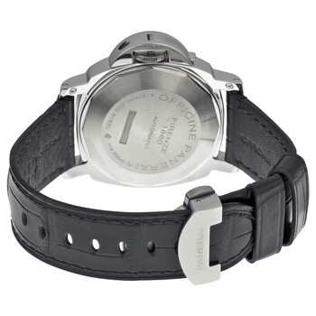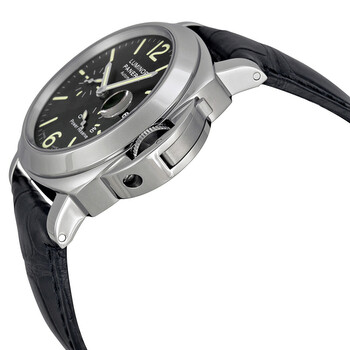 Silver-tone stainless steel case with a black leather strap. Fixed silver-tone stainless steel bezel. Black dial with luminous hands and stick hour markers. Arabic numerals mark the 6 and 12 o'clock positions. minute markers around the outer rim. Dial Type: Analog. Luminescent hands and markers. Date display at the 3 o'clock position. Two: small seconds and power reserve sub dials subdials. Panerai Calibre P.6762 automatic movement with a 42-hour power reserve. Scratch resistant sapphire crystal. Pull / push with protective leaver crown. Solid case back. Cushion case shape, case size: 44 mm, case thickness: 14 mm. Band width: 24 mm, band length: 8 inches. Deployment clasp. Water resistant at 300 meters / 1000 feet. Functions: hours, minutes, small seconds, date. Dive watch style. Watch label: Swiss Made. Panerai Luminor Power Reserve Men's Watch PAM00090.