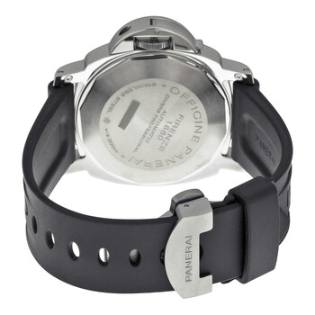 Silver-tone stainless steel case with a black rubber strap. Uni-directional rotating silver-tone stainless steel bezel. Black dial with luminous hands and dot hour markers. Arabic numerals mark the 6 and 12 o'clock positions. Dial Type: Analog. Luminescent hands and markers. Date display at the 3 o'clock position. Seconds sub-dial at the 9 o'clock position subdials. Panerai Calibre OP III Automatic movement, based upon 7750-P1, containing 21 Jewels, bitting at 28800 vph, and has a power reserve of approximately 42 hours. Scratch resistant sapphire crystal. Stainless steel protected by lever crown. Stainless steel with engraved 'officine panerai' engraving case back. Cushion case shape, case size: 44 mm, case thickness: 15.5 mm. Deployment clasp. Water resistant at 300 meters / 1000 feet. Functions: date, hour, minute, small second, chronometer. Dive watch style. Watch label: Swiss Made. Item Variations: PAM24, PANERAI 24. Panerai Luminor Submersible Black Dial Men's Watch PAM00024.