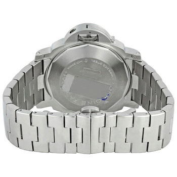 Silver-tone stainless steel case with a silver-tone stainless steel bracelet. Stainless steel silver-tone stainless steel bezel. Black dial with luminous hands and luminous stick hour markers. Arabic numerals mark the 6 and 12 o'clock positions. Dial Type: Analog. Luminescent hands and markers. Date display at the 3 o'clock position. Seconds sub-dial at the 9 o'clock position subdials. Panerai Calibre OP III Automatic movement, based upon 7750-P1, containing 21 Jewels, bitting at 28800 vph, and has a power reserve of approximately 42 hours. Scratch resistant sapphire crystal. Fluted, protected crown. Solid case back. Cushion case shape, case size: 44 mm, case thickness: 16 mm. Band width: 23 mm. Double fold over hidden clasp. Water resistant at 300 meters / 1000 feet. Functions: date, hour, minute, small second, chronometer. Dive watch style. Watch label: Swiss Made. Panerai Luminora Marina Automatic Men's Watch PAM00299.