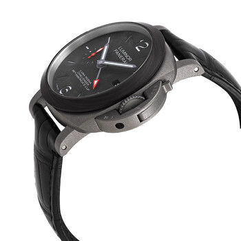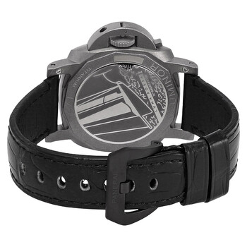 Grey titanium case with a black alligator band. Fixed black titanium bezel. Black dial with black hands and Arabic numeral & index hour markers. Dial Type: Analog. Luminescent hands and markers. Date display at the 3 o'clock position. Automatic movement. Scratch resistant sapphire crystal. Screw down crown. Cushion case shape, case size: 42 mm. Functions: date, hour, minute, second. Luna Rossa Series. Casual watch style. Watch label: Swiss Made. Panerai Luna Rossa Automatic Black Dial Men's Watch PAM01096.