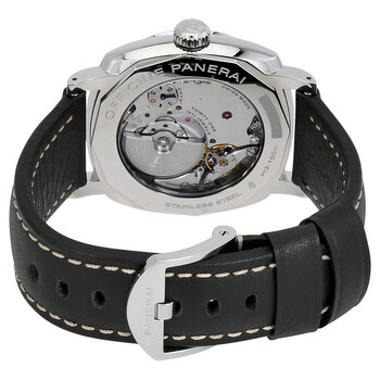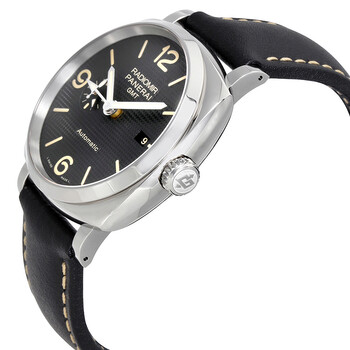 Stainless steel case with a black leather strap. Fixed stainless steel bezel. Black dial with luminous hands and index hour markers. Arabic numerals mark the 6, 9 and 12 o'clock positions. Dial Type: Analog. Luminescent hands and markers. Date display at the 3 o'clock position. 24 hour sub-dial at the 9 o'clock position. Panerai calibre P.4001 automatic movement with a 72-hour power reserve. Scratch resistant sapphire crystal. Screw down crown. Transparent case back. Case size: 45 mm. Cushion case shape. Band width: 24 mm. Tang clasp. Water resistant at 100 meters / 330 feet. Functions: date, hour, minute, second, 24 hour indicator. Luxury watch style. Watch label: Swiss Made. Panerai Radiomir 1940 Automatic Black Dial Men's Watch PAM00627.