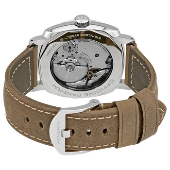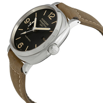 Silver-tone stainless steel case with a brown calfskin leather strap. Fixed silver-tone stainless steel bezel. Black dial with luminous silver-tone hands and index hour markers. Arabic numerals mark the 6, 9 and 12 o'clock positions. Dial Type: Analog. Luminescent hands and markers. Date display at the 3 o'clock position. 24 hour (GMT) indicator subdials. Panerai Calibre P.4001 Automatic movement, containing 31 Jewels, composed of 278 parts, bitting at 28800 vph, and has a power reserve of approximately 72 hours. Scratch resistant sapphire crystal. Screw down crown. Transparent case back. Cushion case shape, case size: 45 mm, case thickness: 17 mm. Band width: 24 mm. Tang clasp. Water resistant at 100 meters / 330 feet. Functions: date, GMT, second time zone, hour, minute, small second, power reserve indicator. Luxury watch style. Watch label: Swiss Made. Panerai Radiomir 1940 Automatic Men's Watch PAM00657.