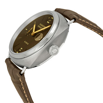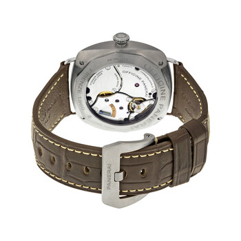 Grey titanium case with a brown leather with contrast stitching strap. Fixed grey titanium bezel. Brown dial with luminous yellow gold-tone hands and index hour markers. Arabic numerals mark the 6 and 12 o'clock positions. Dial Type: Analog. Luminescent hands. Date display at the 3 o'clock position. Small seconds sub-dial at the 9 o'clock position subdials. Panerai Calibre P.2002/9 Hand Wind movement, based upon Panerai P.2002, containing 23 Jewels, composed of 245 parts, bitting at 28800 vph, and has a power reserve of approximately 172 hours. Scratch resistant sapphire crystal. Screw down crown. Transparent case back. Cushion case shape, case size: 45 mm, case thickness: 15.2 mm. Band width: 26 mm. Tang clasp. Water resistant at 100 meters / 330 feet. Functions: hours, minutes, seconds, calendar, 8 day power reserve. Additional Info: limited edition. Luxury watch style. Watch label: Swiss Made. Panerai Radiomir 8 Days Brown Dial Brown Leather Men's Watch PAM00346.