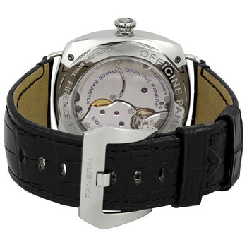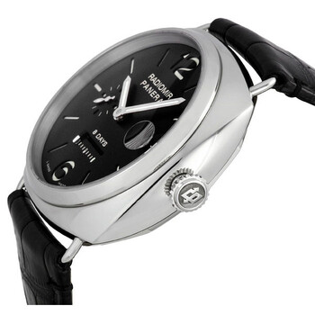 Silver-tone stainless steel case with a black leather strap. Fixed silver-tone stainless steel bezel. Black dial with luminous hands and luminous stick hour markers. Arabic numerals mark the 6 and 12 o'clock positions. Dial Type: Analog. Luminescent hands and markers. Date display at the 3 o'clock position. Two sub-dials displaying: small second and power reserve indicator. Panerai Calibre P.2002/3 Hand Wind movement, containing 21 Jewels, composed of 225 parts, bitting at 28800 vph, and has a power reserve of approximately 192 hours. Scratch resistant sapphire crystal. Stainless steel, onion shaped crown. Sapphire crystal exhibition case back. Cushion case shape, case size: 45 mm. Tang clasp. Water resistant at 100 meters / 330 feet. Functions: hour, minute, small second, power reserve indicator. Radiomir 8 Days Series. Luxury watch style. Watch label: Swiss Made. Panerai Radiomir 8 Days Men's Watch PAM00268.