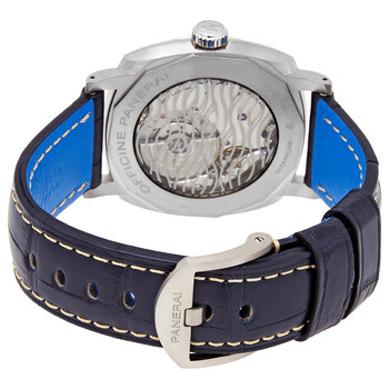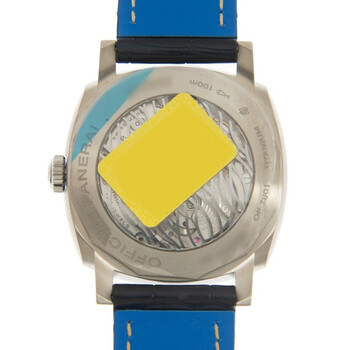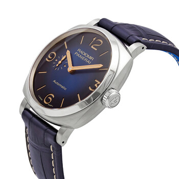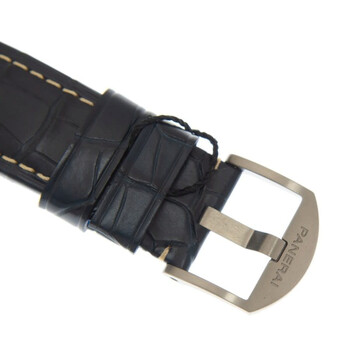 Grey titanium case with a blue (alligator) leather strap. Fixed grey titanium bezel. Blue dial with luminous rose gold hands and index hour markers. Arabic numerals appear at the 3, 6, 9 and 12 o'clock positions. Dial Type: Analog. Luminescent hands. Small seconds sub-dial. Panerai calibre P.4000 automatic movement, containing 31 Jewels, composed of 203 parts, bitting at 28800 vph, and has a power reserve of approximately 72 hours. Scratch resistant sapphire crystal. Screw down crown. Transparent case back. Tonneau case shape. Case size: 45 mm. Case thickness: 13 mm. Band width: 24 mm. Tang clasp. Water resistant at 100 meters / 330 feet. Functions: hour, minute, small second. Additional Info: original box, manual (complete accessories). Radiomir Series. Luxury watch style. Watch label: Swiss Made. Panerai Radiomir Automatic Blue Dial Men's Watch PAM01078.