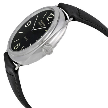 Stainless steel case with a black leather strap. Fixed stainless steel bezel. Black dial with luminous hands and index hour markers. Arabic numerals mark the 3, 6, 9 and 12 o'clock positions. Dial Type: Analog. Panerai calibre P.5000 hand wind movement with a 192-hour (8 day) power reserve. Scratch resistant sapphire crystal. Screw down crown. Transparent case back. Case size: 45 mm.Case thickness: 13 mm. Cushion case shape. Band width: 22.9 mm. Band length: 9 inches. Tang clasp. Water resistant at 100 meters / 330 feet. Functions: hour, minute, second. Luxury watch style. Watch label: Swiss Made. Panerai Radiomir Black Dial Leather Men's Watch PAM00610.