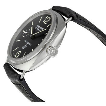 Silver-tone stainless steel case with a black leather strap. Fixed silver-tone stainless steel bezel. Black dial with luminous black hands and index hour markers. Arabic numerals mark the 6 and 12 o'clock positions. minute markers around the outer rim. Dial Type: Analog. Luminescent hands and markers. Seconds subdials. Panerai Calibre OP II Hand Wind movement, based upon ETA 6497-1, containing 17 Jewels, bitting at 21600 vph, and has a power reserve of approximately 56 hours. Scratch resistant sapphire crystal. Fluted crown. Solid case back. Cushion case shape, case size: 45 mm, case thickness: 15.2 mm. Band width: 22 mm. Tang clasp. Water resistant at 100 meters / 330 feet. Functions: hour, minute, small second, chronometer. Casual watch style. Watch label: Swiss Made. Panerai Radiomir Black Seal Men's Watch PAM00380.