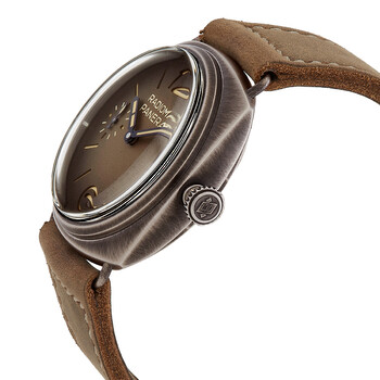 Silver-tone stainless steel case with a brown leather strap. Fixed silver-tone stainless steel bezel. Brown dial with blue hands and index-Arabic numeral hour markers. Dial Type: Analog. Luminescent hands. One-small second subdials. Automatic movement. Scratch resistant sapphire crystal. Transparent case back. Cushion case shape, case size: 45 mm. Water resistant at 100 meters / 330 feet. Functions: hour, minute, second. Radiomir Series. Sport watch style. Watch label: Swiss Made. Panerai Radiomir Automatic Brown Dial Men's Watch PAM01347.