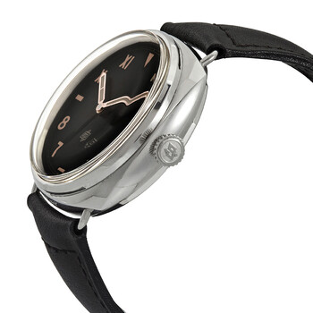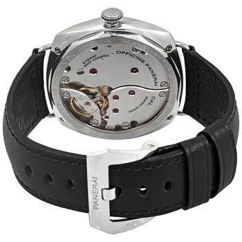 Stainless steel case with a black leather strap. Fixed stainless steel bezel. Black dial with luminous rose gold-tone hands and index / Arabic numeral / Roman numeral hour markers. Minute markers around the outer rim. Dial Type: Analog. Luminescent hands. Hand wind movement. Scratch resistant sapphire crystal. Screw down crown. Transparent case back. Cushion case shape. Case size: 47 mm. Case thickness: 16 mm. Band width: 26 mm. Tang clasp. Water resistant at 100 meters / 330 feet. Functions: hour, minute. Radiomir California Series. Luxury watch style. Watch label: Swiss Made. Panerai Radiomir California Hand Wind Black Dial Men's Watch PAM00424BK.