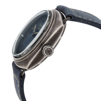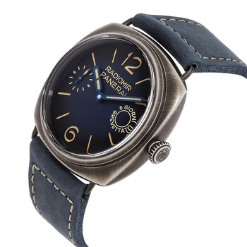 Silver-tone stainless steel case with a blue leather strap. Brunito steel silver-tone stainless steel bezel. Blue dial with blue hands and index hour markers. Dial Type: Analog. Luminescent hands and markers. One subdial displaying: small second. Panerai Calibre P.5000 Hand Wind movement, containing 21 Jewels, composed of 127 parts, bitting at 21600 vph, and has a power reserve of approximately 192 hours. Scratch resistant sapphire crystal. Screw down crown. Transparent see through case back. Round case shape, case size: 45 mm. Buckle clasp. Water resistant at 100 meters / 330 feet. Functions: hour, minute, small second. Additional Info: original box, international warranty card, manual (complete accessories). Radiomir Otto Giorni Series. Luxury watch style. Watch label: Swiss Made. Panerai Radiomir Otto Giorni Hand Wind Blue Dial Men's Watch PAM01348.