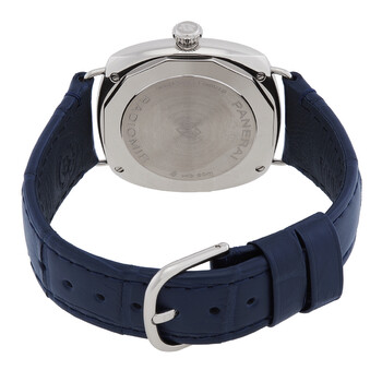Silver-tone stainless steel case with a blue alligator band. Fixed silver-tone stainless steel bezel. Blue dial with gold-tone hands and index hour markers. Dial Type: Analog. Luminescent hands and markers. Date display at the 3 o'clock position. One subdial displaying: small second. Panerai Calibre P.900 Automatic movement, based upon Panerai OP XXXIV, containing 25 Jewels, bitting at 28800 vph, and has a power reserve of approximately 72 hours. Scratch resistant sapphire crystal. Solid case back. Round case shape, case size: 40 mm. Water resistant at 30 meters / 100 feet. Functions: date, hour, minute, small second. Additional Info: original box, international warranty card, manual (complete accessories). Radiomir Quaranta Series. Luxury watch style. Watch label: Swiss Made. Panerai Radiomir Quaranta Automatic Blue Dial Men's Watch PAM01293.