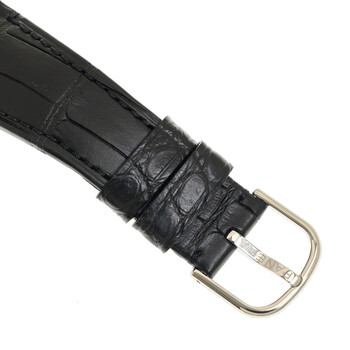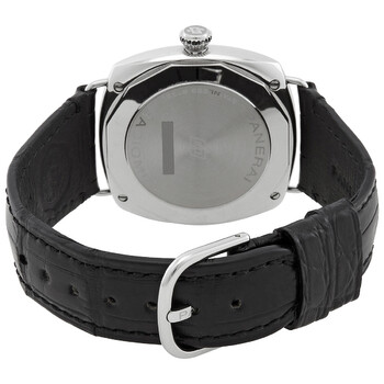 Silver-tone stainless steel case with a black alligator band. Fixed silver-tone stainless steel bezel. Black dial with rose gold-tone hands and index hour markers. Dial Type: Analog. Date display at the 3 o'clock position. One subdial displaying: small second. Panerai Calibre P.900 Automatic movement, based upon Panerai OP XXXIV, containing 25 Jewels, bitting at 28800 vph, and has a power reserve of approximately 72 hours. Scratch resistant sapphire crystal. Solid case back. Round case shape, case size: 40 mm. Water resistant at 30 meters / 100 feet. Functions: date, hour, minute, small second. Additional Info: original box, manual (complete accessories). Radiomir Quaranta Series. Luxury watch style. Watch label: Swiss Made. Panerai Radiomir Quaranta Automatic Black Dial Men's Watch PAM01294.