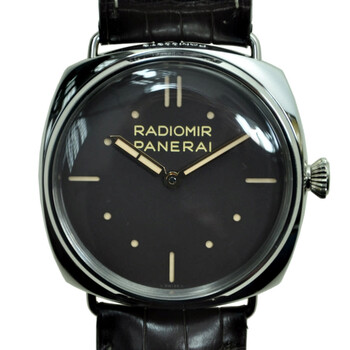 White polished platinium case with a dark brown alligator leather strap. Fixed white platinium bezel. Brown dial with luminous hands and index hour markers. Dial Type: Analog. Luminescent hands and markers. Panerai Calibre P.3000 Hand Wind movement, containing 21 Jewels, composed of 160 parts, bitting at 21600 vph, and has a power reserve of approximately 72 hours. Scratch resistant sapphire crystal. Platinum crown. Skeleton case back. Cushion case shape. Case size: 47 mm. 18 kt white gold tang clasp. Water resistant at 100 meters / 330 feet. Functions: hour, minute. Luxury watch style. Watch label: Swiss Made. Panerai Radiomir Three Days Platino Manual Wind Platinum Men's Watch PAM00373.