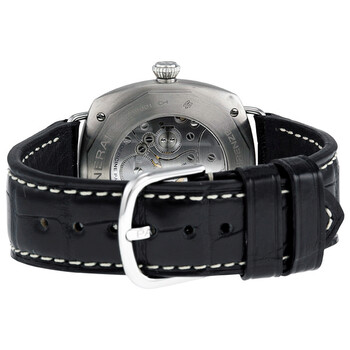 Grey titanium case with a black leather strap. Fixed grey titanium bezel. Black dial with luminous hands and index hour markers. Arabic numerals mark the 6 and 12 o'clock positions. Dial Type: Analog. Luminescent hands and markers. Small seconds sub-dial subdials. Panerai Calibre P.999 Hand Wind movement, containing 19 Jewels, composed of 154 parts, bitting at 21600 vph, and has a power reserve of approximately 60 hours. Scratch resistant sapphire crystal. Solid case back. Cushion case shape, case size: 42 mm, case thickness: 15.2 mm. Band width: 27 mm, band length: 8 inches. Tang clasp. Water resistant at 100 meters / 330 feet. Functions: hour, minute, small second, chronometer. Luxury watch style. Watch label: Swiss Made. Panerai Radiomir Titanium Black Dial Leather Mechanical Men's Watch PAM00338.