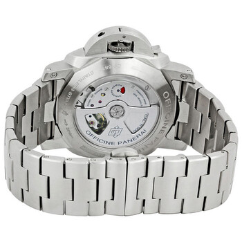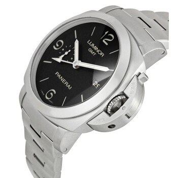 Silver-tone stainless steel case with a silver-tone stainless steel bracelet. Fixed silver-tone stainless steel bezel. Black dial with luminous hands and stick hour markers. Arabic numerals mark the 6, 9 and 12 o'clock positions. Dial Type: Analog. Luminescent hands and markers. Date display at the 3 o'clock position. Small seconds subdials. Panerai Calibre P.9001 Automatic movement, containing 29 Jewels, composed of 229 parts, bitting at 28800 vph, and has a power reserve of approximately 72 hours. Scratch resistant sapphire crystal. Pull / push with protective bar crown. Skeleton case back. Cushion case shape, case size: 44 mm, case thickness: 18 mm. Band width: 24 mm, band length: 8.75 inches. Double fold over hidden clasp. Water resistant at 300 meters / 1000 feet. Functions: GMT, date, hour, minute, small second, power reserve indicator. Dive watch style. Watch label: Swiss Made. Panerai Steel Luminor 1950 GMT Watch PAM00329.