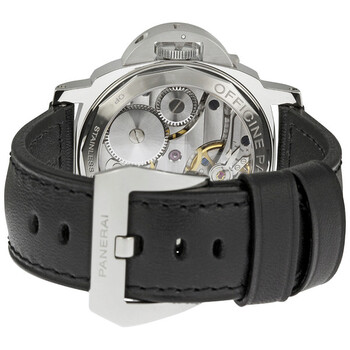 Silver-tone stainless steel case with a black leather strap. Fixed silver-tone stainless steel bezel. White dial with luminous hands and Arabic numeral hour markers. Minute markers around the outer rim. Dial Type: Analog. Luminescent hands and markers. Panerai Calibre OP X Hand Wind movement, based upon ETA 6497-1, containing 17 Jewels, bitting at 21600 vph, and has a power reserve of approximately 56 hours. Scratch resistant sapphire crystal. Stainless steel - protected by lever crown. Polished steel case back. Cushion case shape. Case size: 44 mm. Band width: 24 mm, band length: 8.5 inches. Tang clasp. Water resistant at 300 meters / 1000 feet. Functions: hour, minute. Dive watch style. Watch label: Swiss Made. Item Variations: PAM00114, 00114. Panerai Steel Men's Watch PAM0114.
