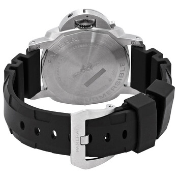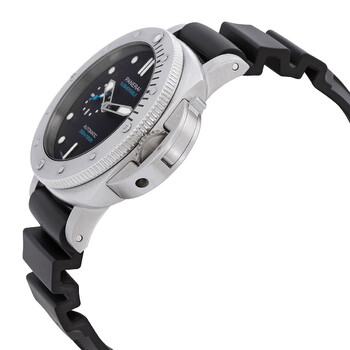 Silver-tone stainless steel case with a black rubber strap. Silver-tone stainless steel bezel. Black dial with silver-tone hands and index hour markers. Dial Type: Analog. Luminescent hands and markers. Date display at the 3 o'clock position. Automatic movement. Scratch resistant sapphire crystal. Cushion case shape, case size: 42 mm. Buckle clasp. Water resistant at 300 meters / 1000 feet. Functions: date, hour, minute, second. Additional Info: original box, international warranty card, manual (complete accessories). Submersible Series. Luxury watch style. Watch label: Swiss Made. Panerai Submersible Automatic Black Dial Men's Watch PAM01973.