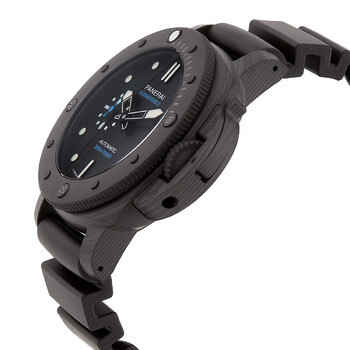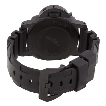 Black carbotech case with a black rubber strap. Bi-directional rotating black carbotech bezel. Black dial with black hands and dots hour markers. Minute markers around the outer rim. Dial Type: Analog. Luminescent hands and markers. Date display at the 3 o'clock position. One-small seconds subdials. Panerai Calibre P.900 Automatic movement, based upon Panerai OP XXXIV, containing 25 Jewels, bitting at 28800 vph, and has a power reserve of approximately 72 hours. Scratch resistant mineral crystal. Screw down crown. Solid case back. Cushion case shape, case size: 42 mm. Water resistant at 300 meters / 1000 feet. Functions: hours , small seconds , calendar aperture , minutes. Submersible Series. Dive watch style. Watch label: Swiss Made. Panerai Submersible Automatic Black Dial Men's Watch PAM02231.