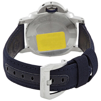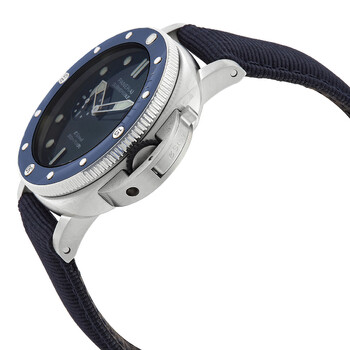 Silver-tone stainless steel case with a blue canvas strap. Bi-directional rotating blue ceramic bezel. Blue dial with silver-tone hands and index hour markers. Dial Type: Analog. Luminescent hands and markers. Date display at the 3 o'clock position. One subdial displaying: small second. Panerai Calibre P.900 Automatic movement, based upon Panerai OP XXXIV, containing 25 Jewels, bitting at 28800 vph, and has a power reserve of approximately 72 hours. Scratch resistant sapphire crystal. Screw down crown. Solid case back. Cushion case shape, case size: 44 mm. Water resistant at 300 meters / 1000 feet. Functions: date, hour, minute, small second. Additional Info: original box, international warranty card, manual (complete accessories). Submersible Series. Luxury watch style. Watch label: Swiss Made. Panerai Submersible Automatic Blue Dial Men's Watch PAM01289.