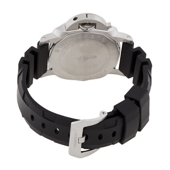Stainless steel case with a black rubber strap. Uni-directional rotating stainless steel bezel. White dial with luminous black hands and dot hour markers. Dial Type: Analog. Luminescent hands and markers. Date display at the 3 o'clock position. Small seconds sub-dial. Panerai calibre P.900 automatic movement, based upon Panerai OP XXXIV, containing 25 Jewels, bitting at 28800 vph, and has a power reserve of approximately 72 hours. Scratch resistant sapphire crystal. Solid case back. Cushion case shape. Case size: 42 mm. Case thickness: 14.37 mm. Tang clasp. Water resistant at 300 meters / 1000 feet. Functions: date, hour, minute, small second. Submersible Series. Luxury watch style. Watch label: Swiss Made. Panerai Submersible Bianco Automatic White Dial Men's Watch PAM01223.