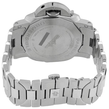 Silver-tone stainless steel case and bracelet. Uni-directional rotating silver-tone stainless steel bezel with ceramic blue ring. Blue dial with silver-tone hands and index hour markers. Dial Type: Analog. Luminescent hands and markers. Date display at the 3 o'clock position. One subdial displaying: small second. Panerai Calibre P.900 Automatic movement, based upon Panerai OP XXXIV, containing 25 Jewels, bitting at 28800 vph, and has a power reserve of approximately 72 hours. Scratch resistant sapphire crystal. Screw down crown. Solid case back. Round case shape, case size: 42 mm. Water resistant at 300 meters / 1000 feet. Functions: date, hour, minute, small second. Submersible Blu Notte Series. Luxury watch style. Watch label: Swiss Made. Panerai Submersible Blu Notte Automatic Blue Dial Men's Watch PAM02068.