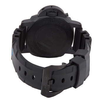 Black carbotech case with a black rubber strap. Uni-directional rotating black carbotech bezel. Black dial with luminous black hands and dot hour markers. Dial Type: Analog. Luminescent hands and markers. Date display at the 3 o'clock position. Small seconds sub-dial. Panerai calibre OP XXXIV Automatic movement, containing 25 Jewels, bitting at 28800 vph, and has a power reserve of approximately 72 hours. Scratch resistant sapphire crystal. Pull / push crown. Solid case back. Cushion case shape. Case size: 42 mm. Tang clasp. Water resistant at 300 meters / 1000 feet. Functions: date, hour, minute, small second. Submersible Carbontech Series. Dive watch style. Watch label: Swiss Made. Panerai Submersible Carbontech Automatic 300 Meters Men's Watch PAM00960.